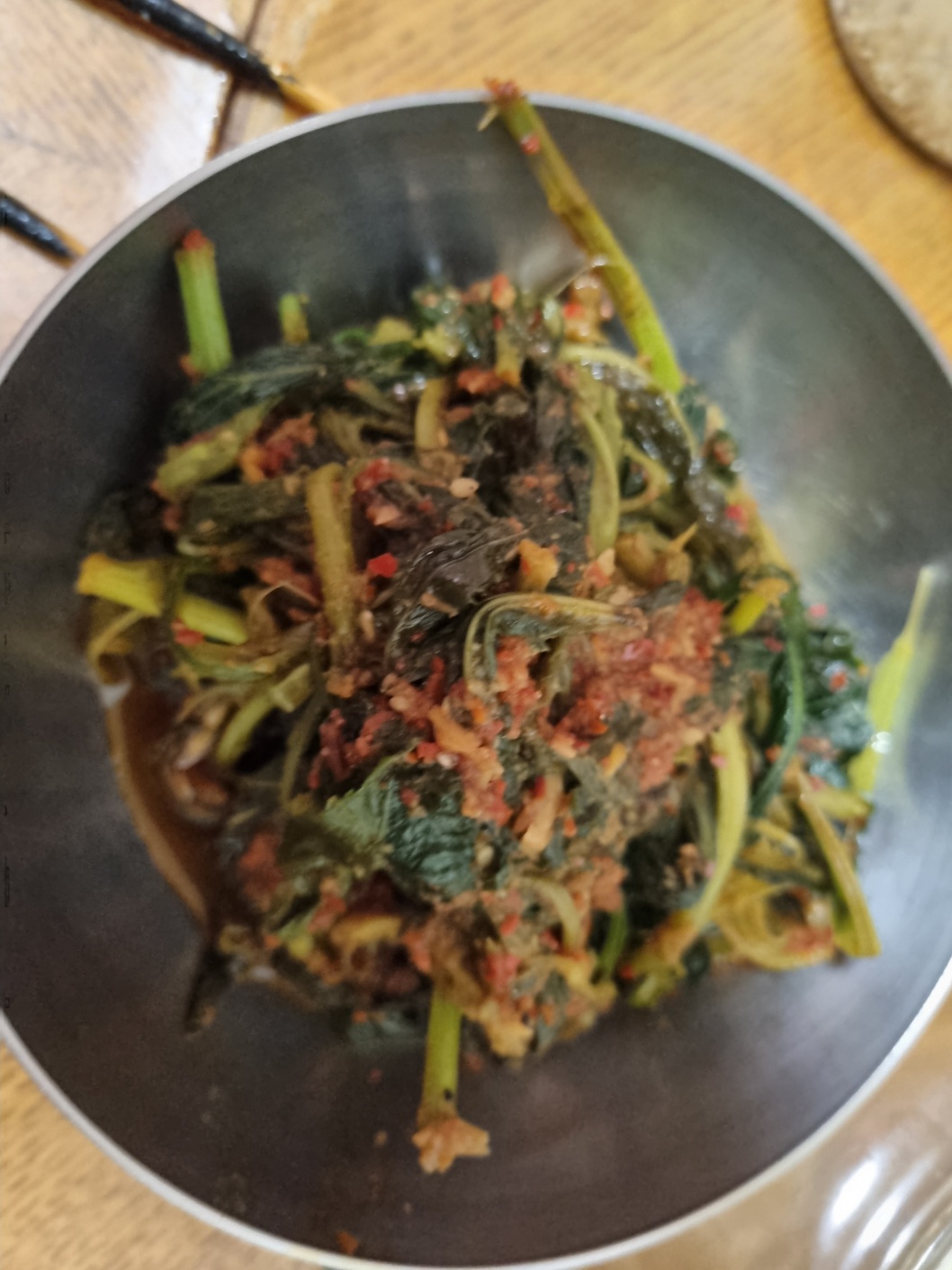 지난번엔 취나물을 데쳐서 된장에 무쳤다면 이번엔 기름에 간장 기반으로 볶아냈다
