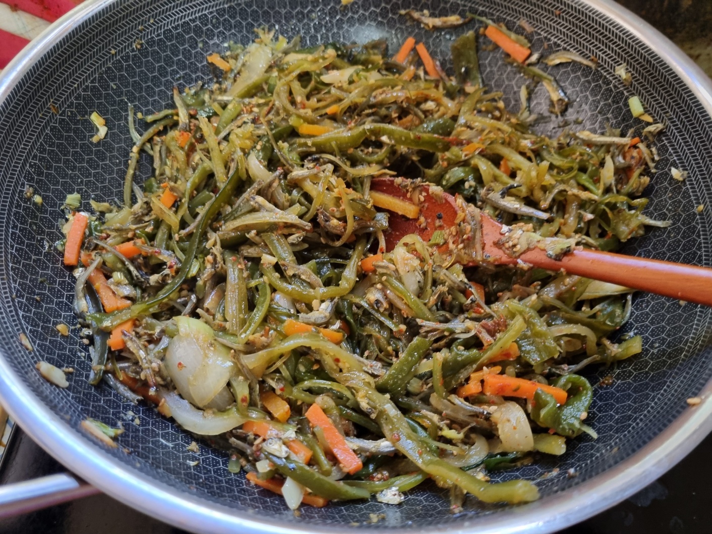 파 마늘 기름에 미역줄기 당근, 양파를 넣고 간장, 액젓, 코인 육수 가루, 설탕, 물엿 등을 넣어 만들었다