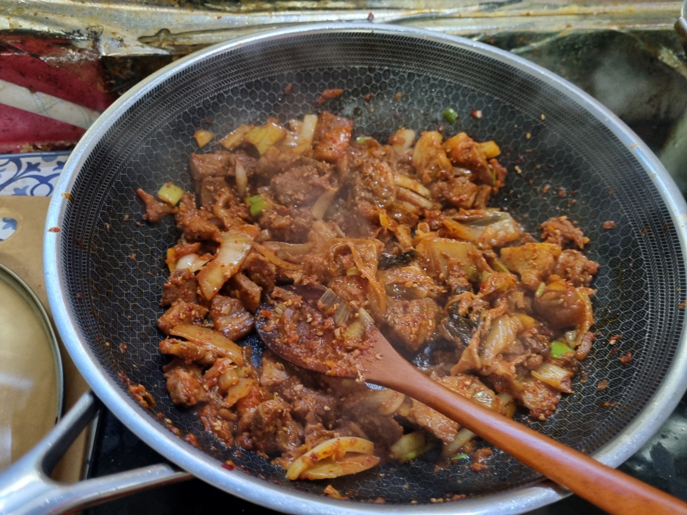 별다른 레시피가 있다기 보다 그냥 돼지고기 남은거 볶다가 김치 넣고 볶고 설탕을 넣어서 밸런스를 맞춘 것이다