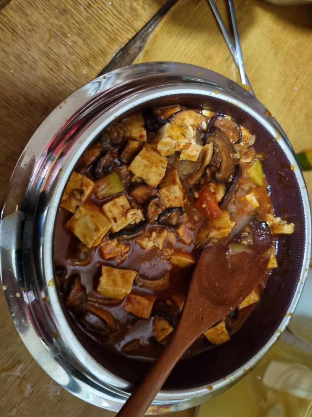 코인육수와 불린 표고, 두부, 애호박, 대파를 넣어서 끓여냈다