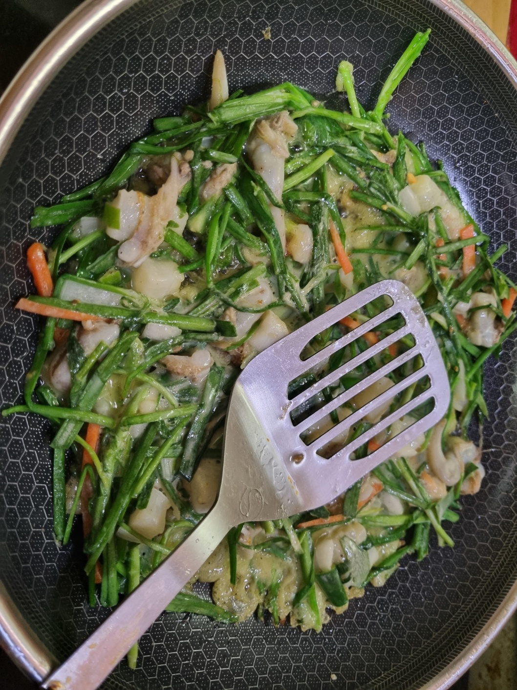 깍두기를 담그고 남은 부추에 냉동해물믹스, 당근, 양파, 대파, 계란 등을 넣어 만들었다
