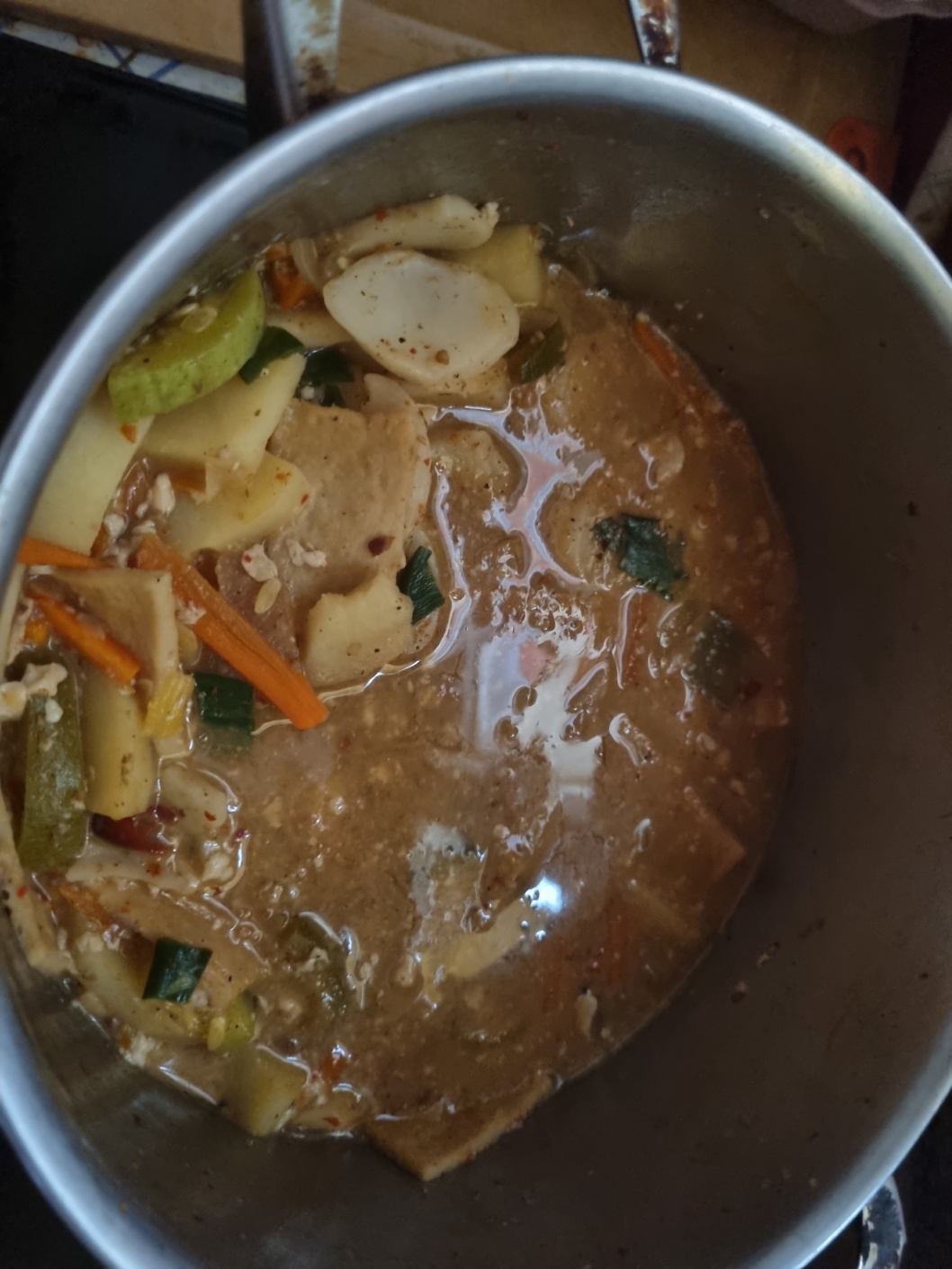 남은 된장찌개에 어묵과 감자, 애호박등 야채를 넣어 육수를 내고 떡국을 끓였다
