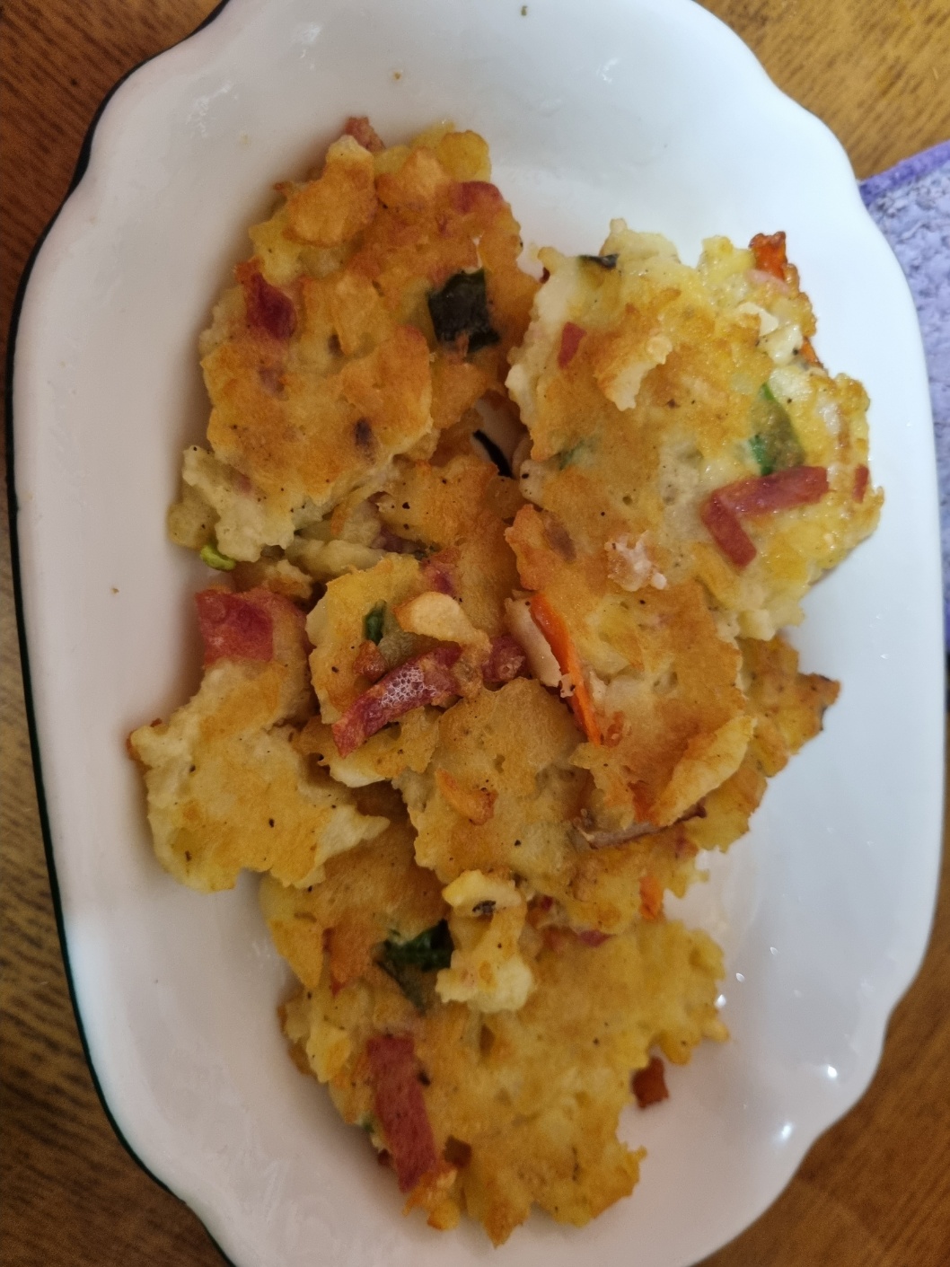 해시 브라운을 살짝 돌린 후에 베이컨, 양파, 당근, 전분가루, 맛소금, 물, 청양고추를 넣고선 부쳐냈다